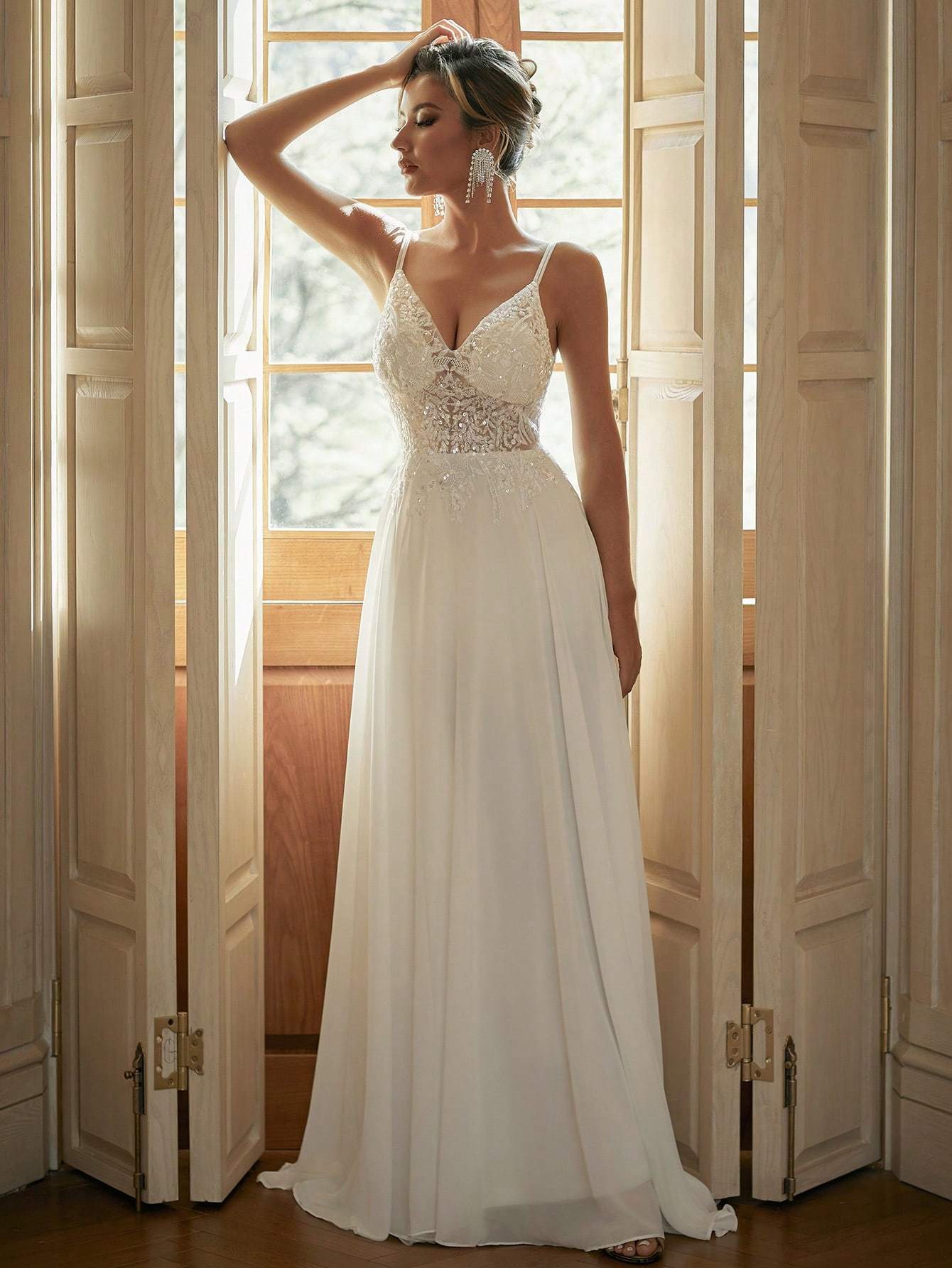 Crafted from flowing chiffon, the skirt cascades into a graceful A - line silhouette with a subtle train, ensuring effortless movement. Perfect for bohemian - inspired or classic weddings, this dress combines delicate detailing with airy comfort, making you feel radiant on your special day.